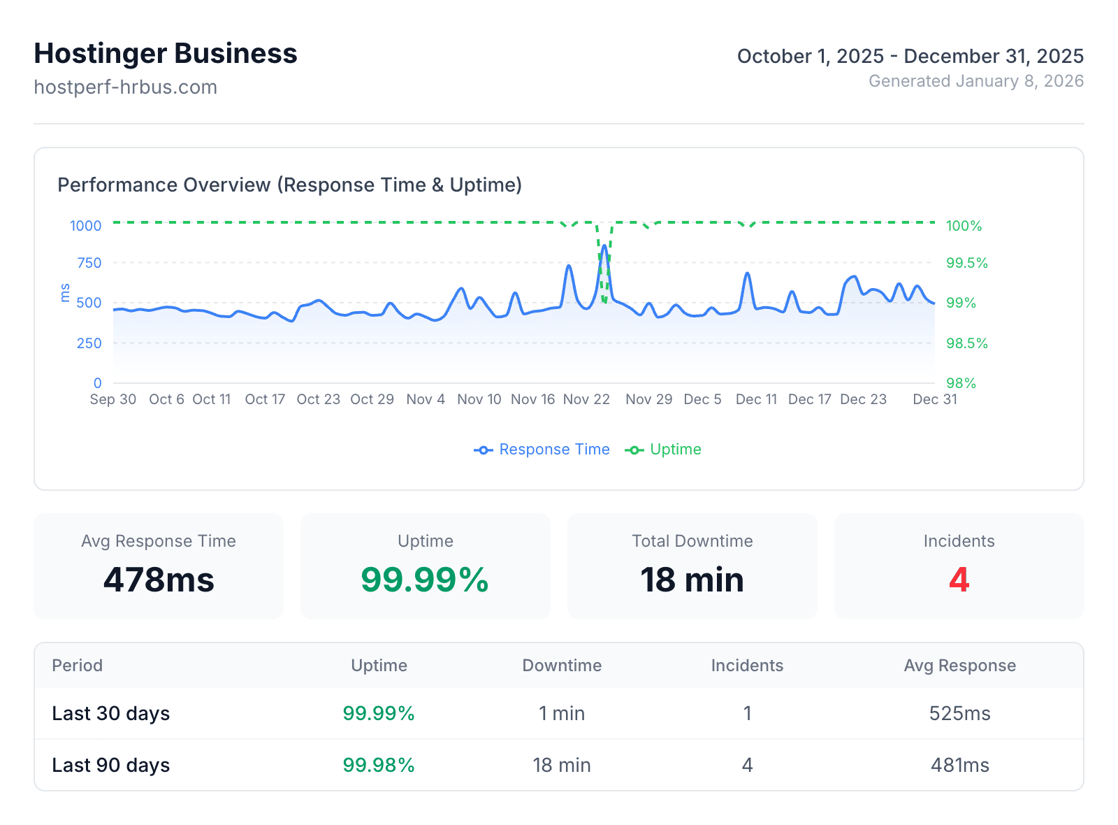 | Hostinger Business | 478 | 7 | 99.98% | 9.0 | 31ms | 0.00% | 9 | 223 | 10 | 5.05 |