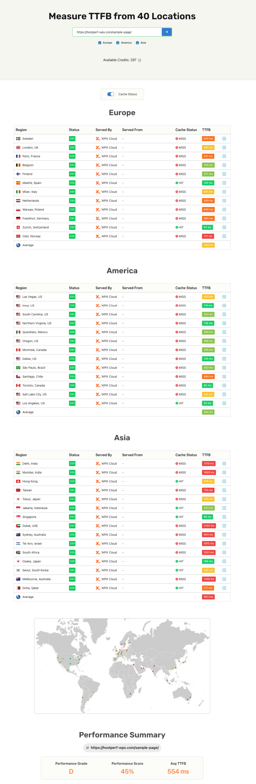 WPX: WPX recorded an excellent performance score in our tests. However, we noticed that first-time visitors often experience high response times, resulting in slow-loading pages. We tested their TTFB from 40 locations and the score varies from 50ms to 2.1 seconds (proof), the highest variations we’ve ever seen with any provider. This makes their CDN not as fast as recorded from our benchmark reports.