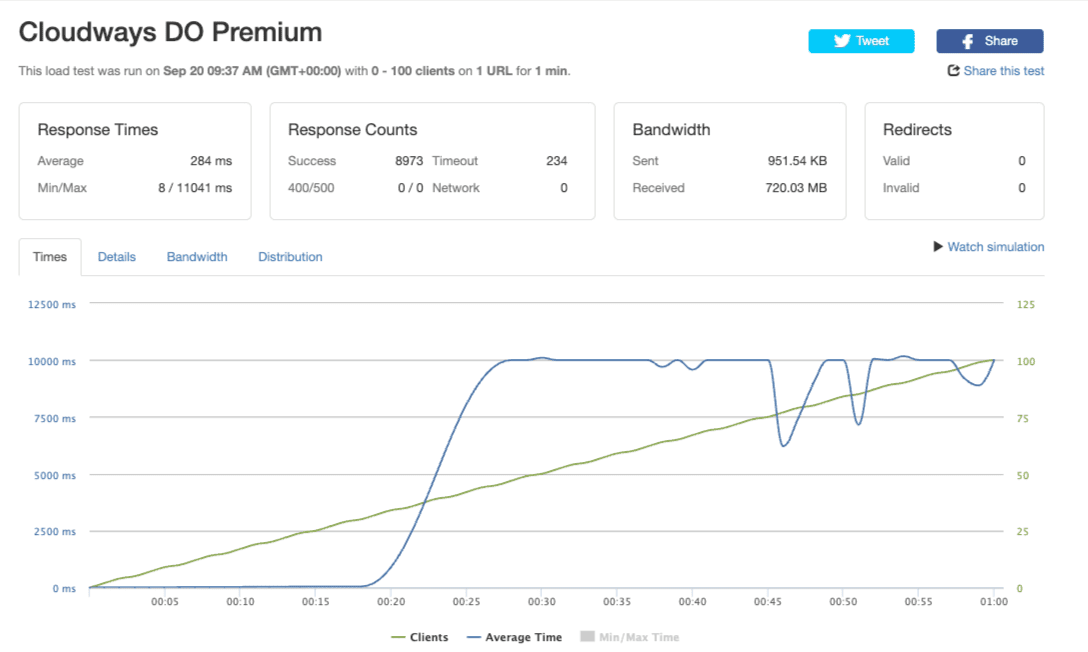 The load test measures how fast the servers work at handling traffic spikes. I sent 500 concurrent visitors to both the premium and standard test sites.