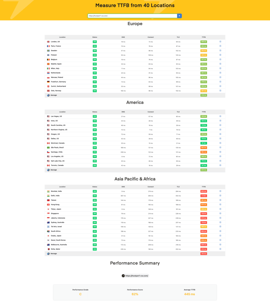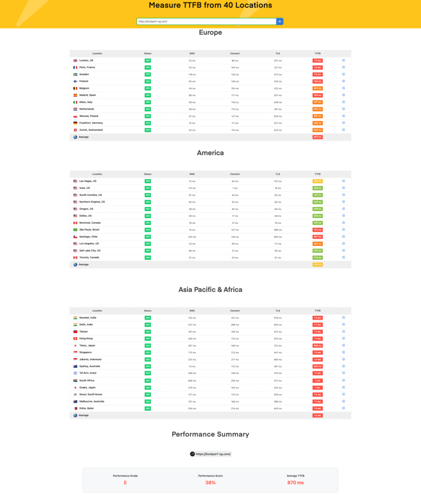 Global TTFB is measured by pinging the test site from 40 global locations. This test is useful for sites intended to receive global traffic.