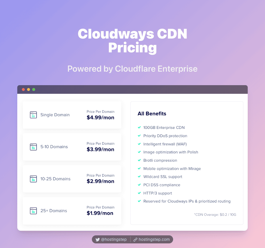 Cloudways offers Cloudflare Enterprise CDN as an add-on for $4.99/domain. It comes with access to 300+ global CDN locations, 100GB Enterprise CDN, and all Cloudflare enterprise features like Edge page caching, argo smart routing, etc.