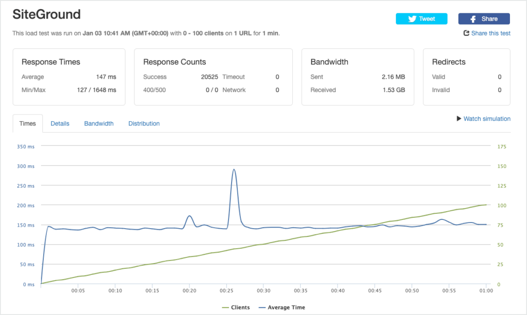 Load Testing is done to measure how SiteGround or Cloudways reacts when the sites receive 100 constant visitors at a time. Our data shows that SiteGround recorded an average response time of 147ms, while Cloudways recorded 128ms.