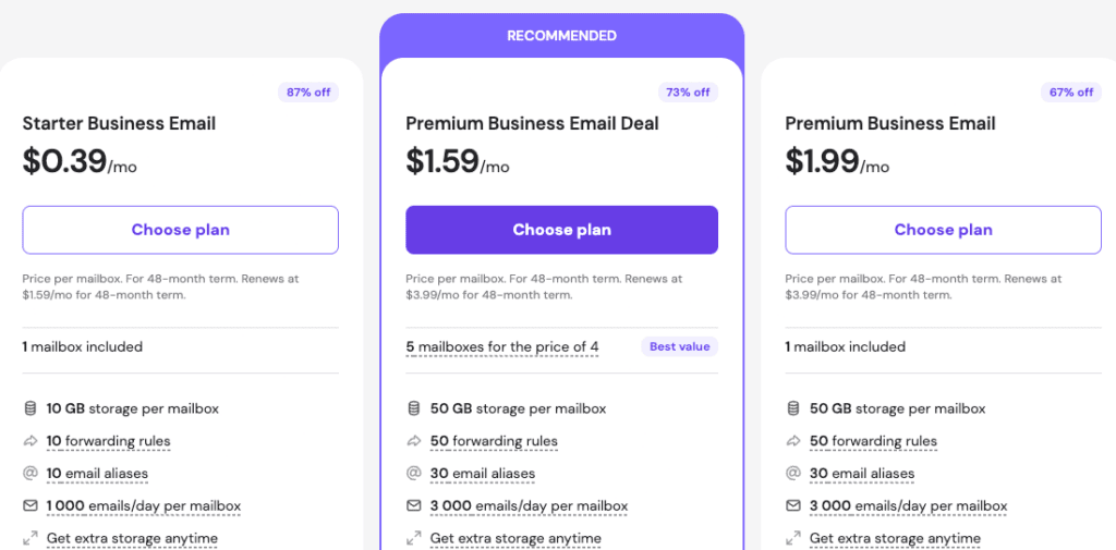 Hostinger offers standalone email hosting plan with discounts up to 87% off. The plan starts at $0.39/month with 1 mail box and 10 GB storage. The storage space can be extended at anytime when needed.