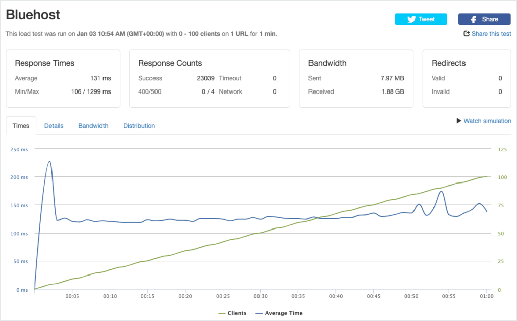 Bluehost recorded an average response time of 170 ms with an error rate of 9% under a load of 100 visitors in 60 seconds. The host scored 6 out of 10 in the Load Test. The 9% error rate means 9 out of every 100 visitors received an error during the traffic spike and were not able to access the page they tried to access.