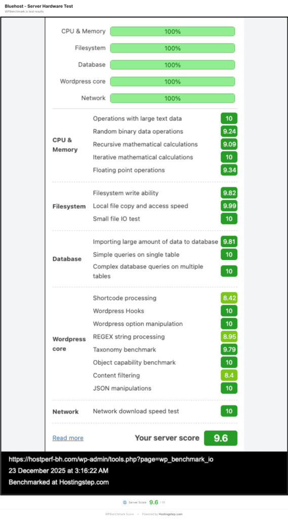 The WPBench test tests the host’s non-cached server resources such as CPU, RAM, and disk I/O with 21 individual sub tests across 5 categories, independent of web server software such as LiteSpeed or Apache or Nginx. A score of 9.6 out of 10 means Bluehost has excellent server hardware, which is advantageous for plugin heavy sites or WooCommerce stores or sites with complex database queries. The fact that Bluehost still has lower TTFB of 520 ms is because of lack of aggressive caching in the Starter plan.
