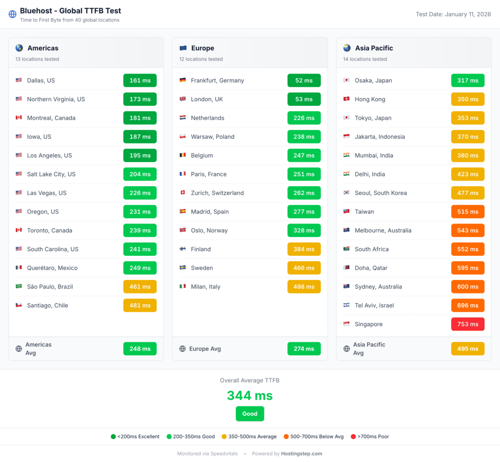 In the Global TTFB test, Bluehost recorded a Global TTFB Average of 344 ms, scoring 9 out of 10, which is Elite-tier. The TTFB across America is 248 ms and across Europe and Asia Pacific is 274 ms and 495 ms respectively. This is another Bluehost strong performance metrics.
