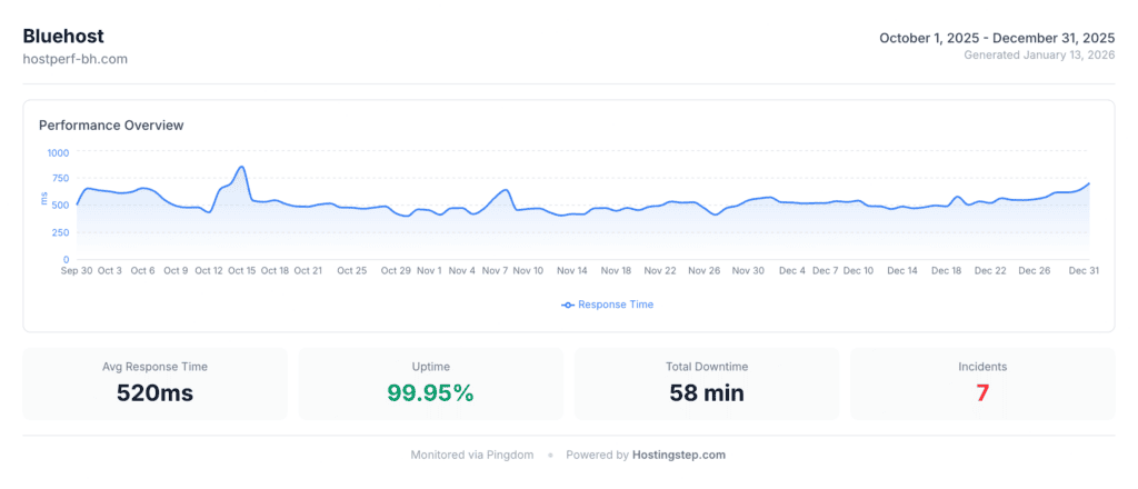 We have been testing and monitoring Bluehost since 2021 with over 516,000 tests conducted on 22 US locations in our 2025 Q4. The host recorded an average TTFB of 520 ms and an uptime of 99.95%. Bluehost ranked 14 out of 34 in our 2026 WordPress hosting rankings scoring 6.90 out of 10.Â