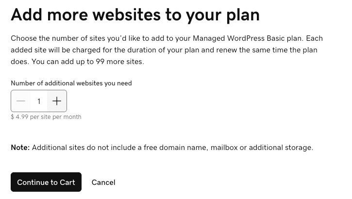 GoDaddy Basic and Deluxe plans each offer one website. Ultimate offers 3 websites on its plans. You can also add more sites to any plan for $4.99/month. Letโs say you have a ~5GB site: you can pay $4.99/month and add it to your Basic Package. Likewise, storage space can be expanded without changing the plan. This is the first time Iโve seen GoDaddy offer so many upgrades within the plans, without trying to upsell to higher plans.