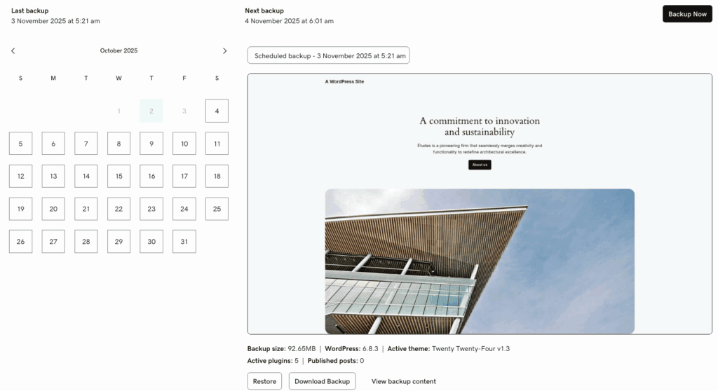 Backups are a straightforward process. It takes weekly or daily backups without issues and stores them for 30 days. It shows a calendar option, choose any date, and click to restore. There is nothing complicated here. GoDaddy provides the option to restore or download a backup and to view it. The backups feature is in a separate tab on their dashboard, which makes it harder to find. But once you know where the tab is located, it will be easier.
