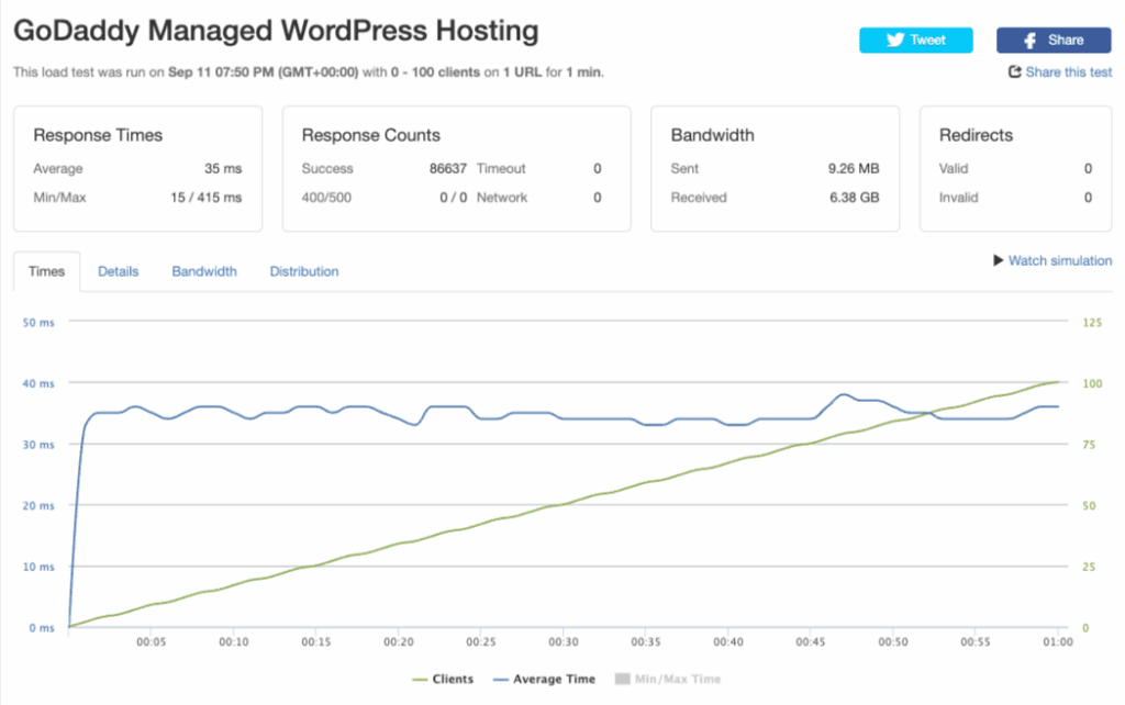 GoDaddy handled our load test exceptionally well at an average response time of 35ms. We started the test with 0 users, and it increased by 1 every second until it reached 100 users. The graph shows that as the load per second increased, the response time remained between 30ms and 40ms, with no uneven fluctuations in handling the load.ย They are in our top 10 fastest load-handling hosts out of the 25 hosts weโve tested so far. The response counts are excellent, with no timeouts, 400s/500s, and Network errors. It indicates it handled all our loads without any issues.