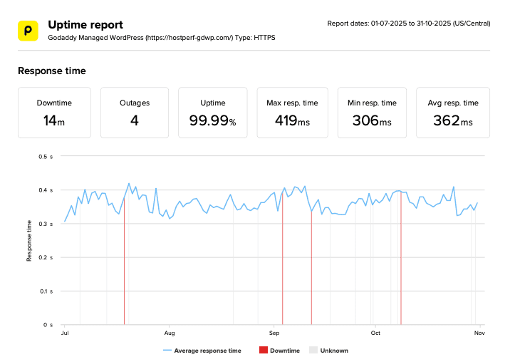 The GoDaddy WordPress hosting offers elite response times, thanks to Cloudflare Enterprise. We purchased our hosting plan on June 30, 2025, installed a WordPress site per GoDaddy instructions, and began monitoring the site on July 1, 2025. We have collected over 4 months of data (~120 days), and the average response time is 362ms. The minimum and maximum response times are within certain limits. This indicates that sites hosted on GoDaddy WordPress hosting can handle your site visitors faster.ย