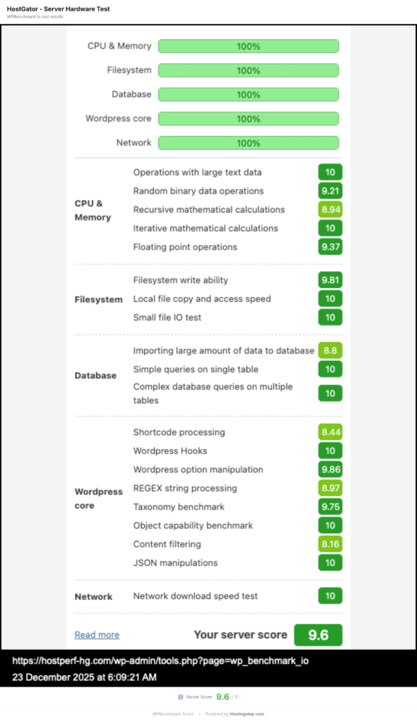 WordPress sites with over 20 plugins and complex theming with Elementor, Divi or WooCommerce can largely benefit from HostGator’s strong server hardware. The host scored 9.6 out of 10 in WPBench, ranking first among 34 providers for raw server performance, which includes CPU, memory, and disk I/O. There is no other provider with such raw server performance at such a low price point.