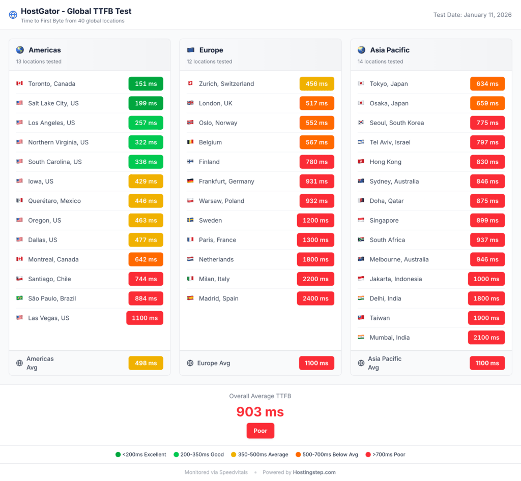 HostGator recorded a global TTFB of 903 ms, scoring 4 out 10. The host is the worst performer in terms of global TTFB among 34 providers that we tested. This number is crucial for sites that have visitors outside the US. Even though HostGator uses a static CDN, it serves images, CSS, and JS from the edge but serves HTML from the origin. Now, this is bearable for sites with an American audience alone but the delivery gets really worse across Europe and Asia. HostGator’s Static CDN is not able to fix the latency of HTML delivery.
