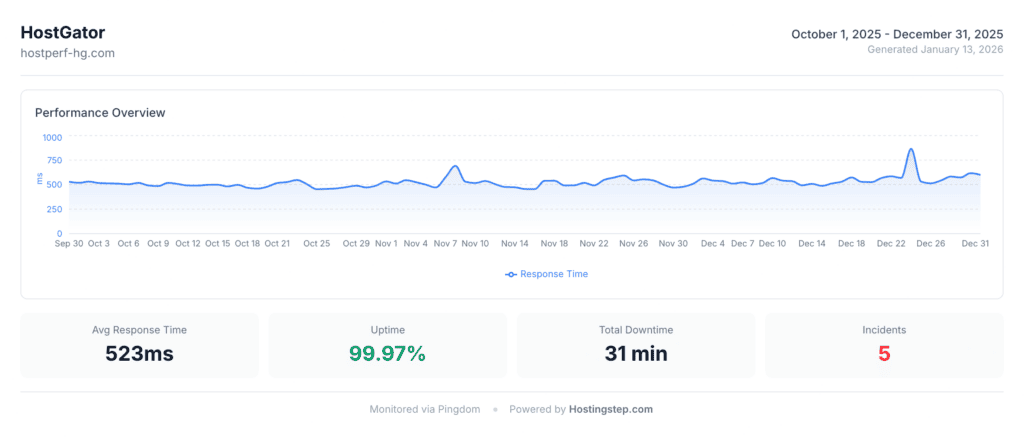 We purchase hosting accounts with our own funds and conduct our tests using tools comprising Pingdom, GTmetrix, Loader.io, WPBenchmark, and SpeedVitals. We conducted over 525,600 tests per provider every year. Our weightage system comprises 60% on performance, 30% on features, 10% on value and 5% on hardware. Our methodology data period is 2025 Q4 from Oct 1 to Dec 31. In this article, we presented and referred to HostGator’s Historical data from 2021 to 2025. We tested a total of 34 providers.