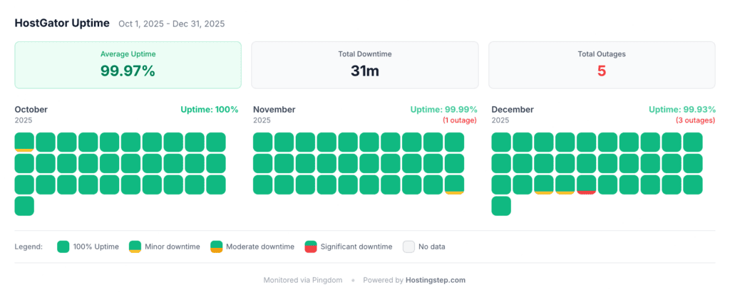 As we compare HostGator’s uptime with that of its competitors, HostGator beats Bluehost with 99.97% vs 99.95%. Hostinger Business is the best with 99.998%. SiteGround has the same uptime as HostGator with 99.97%. However, SiteGround had more outages than HostGator in 2025 with 44 outages vs 19 outages. HostGator had a total downtime of 45.2 hours over 5 years.