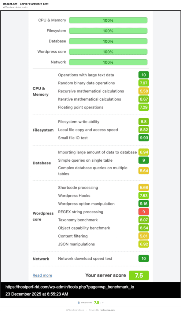 Rocket.net records a server hardware score of 7.5/10. The score is a mid-range, and in fact, Rocket.net has slipped a few positions from the previous year’s data, as it usually scores between 8 and 8.5.