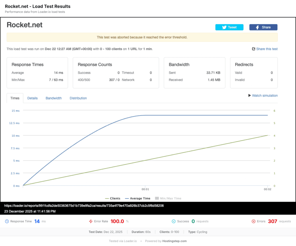 Our Rocket.net load test is blocked by Cloudflare security settings. We have been doing the load test for Rocket.net since 2021 without any issues. I reached out to the Rocket.net Team, including their CEO Ben Gabler, but they seem not to be interested in working with us. This is despite we have been recommending and sending them consistent leads for years. So, we don’t have any data to support their load test performance claims. Rocket.net is the only premium managed host that blocks load test while we have completed load test with all other providers like WP Engine, Kinsta, Liquid Web, Cloudways and Pressable.