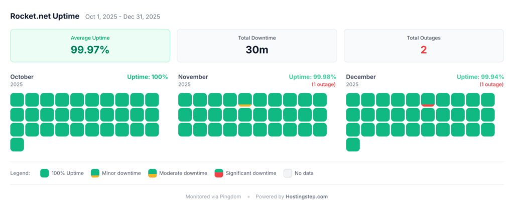 Rocket.net recorded an average uptime of 99.97% in Q4 2025. Using our scoring methodology (100% = 10, 99.99% = 9.5, 99.98% = 9, 99.97% = 8.5), Rocket.net earned a score of 8.5/10 in the uptime test. Only 4 other providers in Q4 2025 have recorded 100% uptime, indicating they’re much superior to most other hosts.