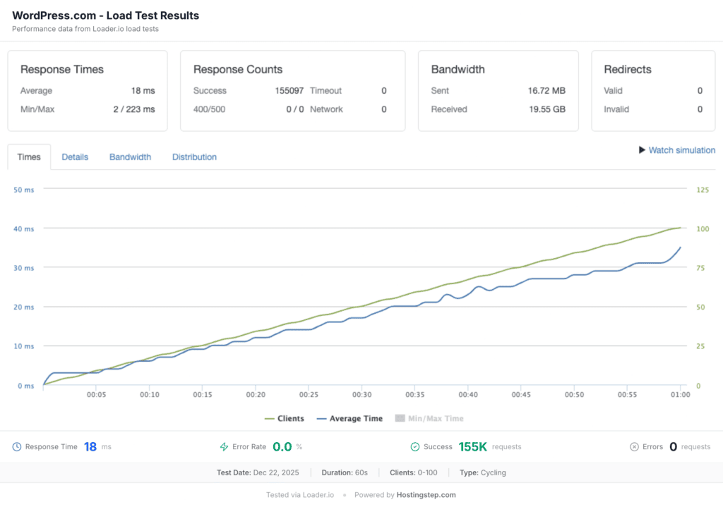 WordPress.com recorded an average 16ms response time in our load testing. The score again lands them in the “Elite” tier. Load test reveals how the servers handle the traffic pressure. We use Loader.io to send 100 concurrent visitors to the site and WordPress.com conveniently handles the load with no volatility as seen from the graph.