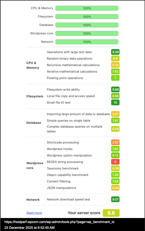 WordPress.com recorded a server hardware score of 6.8, landing in the “strong” tier. This is the only metric where WordPress.com didn’t land in Elite tier but the strong tier itself a good performance considering most of the shared hosts scores below 5.0 due to shared server resources. Using this plugin, we are performing 21 individual tests across CPU, memory, filesystem, database and WordPress core operations.